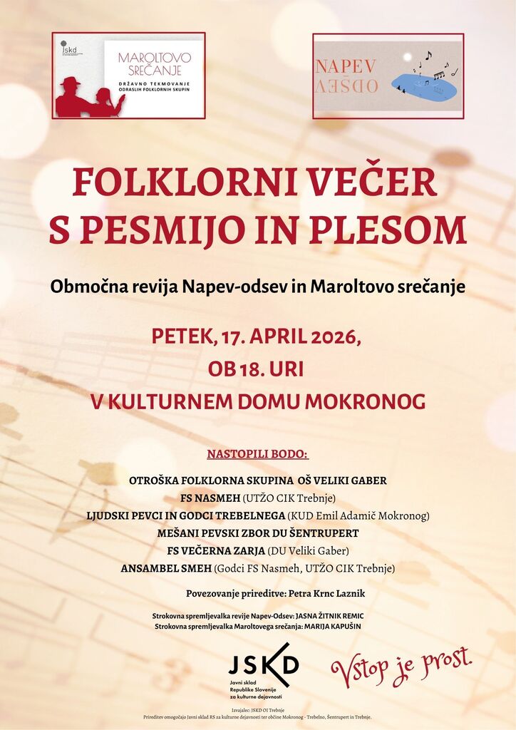 Vljudno vabljeni na Folklorni večer s pesmijo in plesom- Območno revijo Napev-odsev in Maroltovo srečanje.