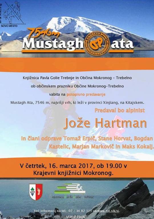 Predaval bo alpinist Jože Hartman in člani odprave Tomaž Erpič, Stane Horvat, Bogdan Kastelic, Marjan Markovič in Maks Kokalj, v četrtek, 16. marca 2017, ob 19.00 v Krajevni knjižnici Mokronog.