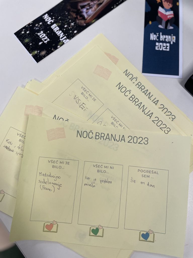 Za izvedbo nepozabne noči branja se iskreno zahvaljujemo organizatorkam – učiteljicama Anji in Katarini ter knjižničarki Sandri. Upamo, da bomo naslednje leto ponovili izkušnjo. Posebna zahvala pa gre tudi naši prečudoviti kuhinji, ki je poskrbela, da nismo bili nikoli lačni.