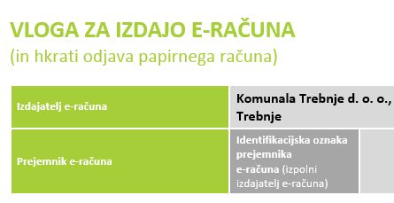 Vlogo najdete na naši spletni strani v zavihku Obrazci, vloge in e-račun. Vlogo posredujete na naš naslov eracuni@komunala-trebnje.si ali pa se prijavite preko e-portala in že prihodnji mesec boste prejeli vaš e-račun. Tako boste v koraku s časom in na pravi poti k ohranjanju našega okolja.