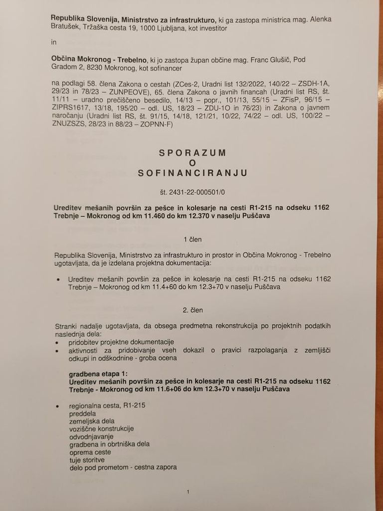 Župan mag. Franc Glušič je danes podpisal Sporazum o sofinanciranju ureditve mešanih površin za pešce in kolesarje v naselju Puščava in v sodelovanju z Ministrstvom za infrastrukturo bo razpis za izvajalca del objavljen že v letošnjem letu.