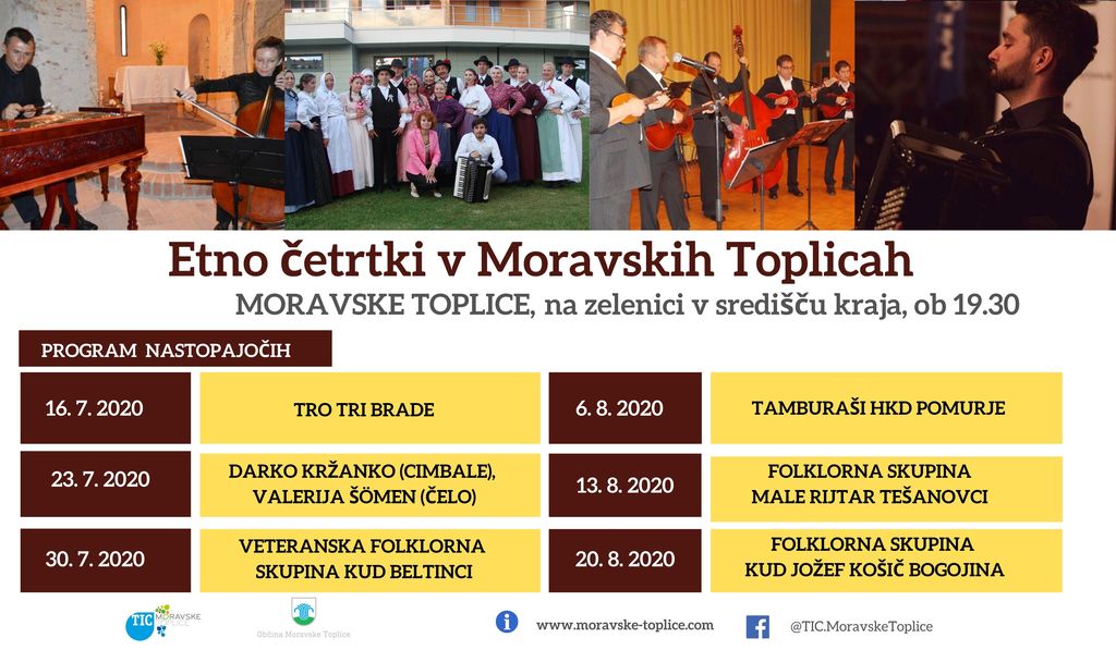 Etno program je na sporedu ob četrtkih v juliju in avgustu od 19.30 naprej na zelenici pod zvezdastim šotorom v središču Moravskih Toplic.