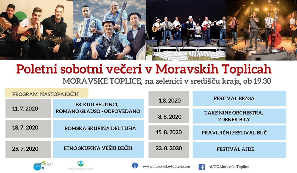 Glasbeno obarvani tematski poletni večeri potekajo ob sobotah od sredine julija do sredine avgusta od 19.30 naprej na zelenici pod zvezdastim šotorom v središču Moravskih Toplic.