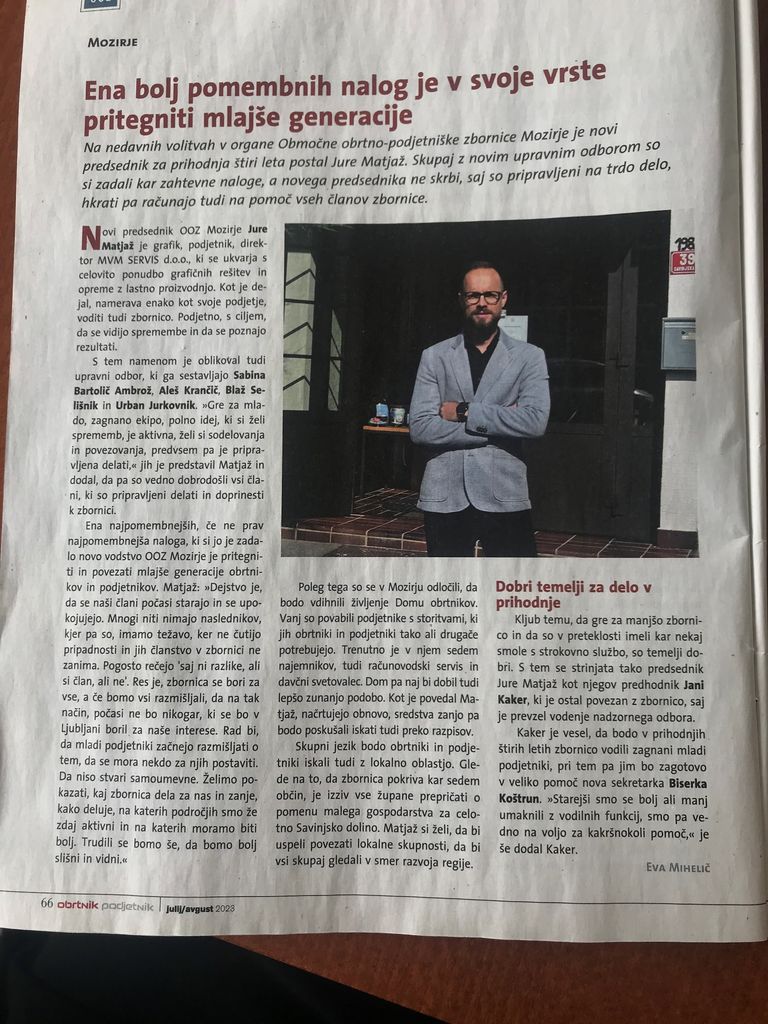 Novi predsednik OOZ Mozirje Jure Matjaž je opravil intervju za revijo Obrtnik na lokaciji Savinjska cesta 39, Mozirje, kjer je lociran Dom obrtnikov takratnega obrtnega združenja v Mozirju. Predstavi svoje sodelavce v upravnem odboru in razkrije načrtovane plane za dodeljen mandat.