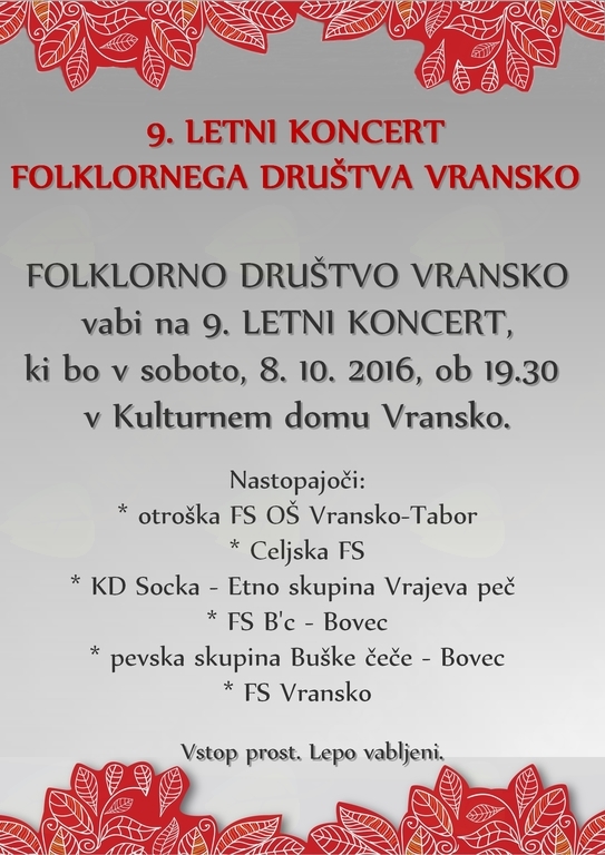 FOLKLORNO DRUŠTVO VRANSKO vabi na 9. LETNI KONCERT,