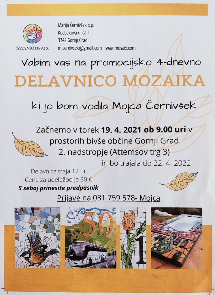 V torek 19. 4. 2022 bo ob 9.00 v prostorih kulturnega doma Gornji Grad, sejna soba, 2. nadstropje, začetek 4-dnevne Delavnice mozaika. Srečevali se bomo od torka 19.2.2022 do petka 22.4.2022 med 9.00 in 12.00 uro.
