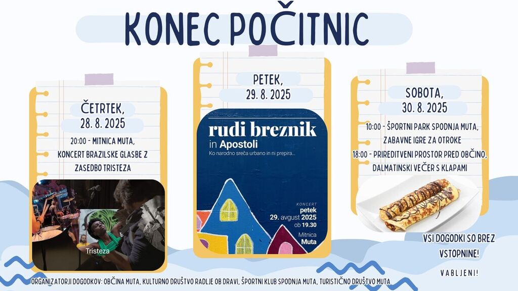 Občina Muta v sodelovanju s Kulturnim društvom Radlje ob Dravi, Športnim klubom Spodnja Muta in Turističnim društvom vabi na dogodke ob koncu letošnjih počitnic.