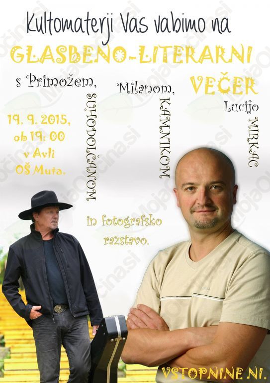 Sekcija Kultomaterji vabijo na glasbeno-literarni večer s Primožem Suhadolčanom, Milanom Kamnikom in Jucijo Mirkac, ki bo v soboto 19.9.2015 ob 19. uri v Avli OŠ Muta.