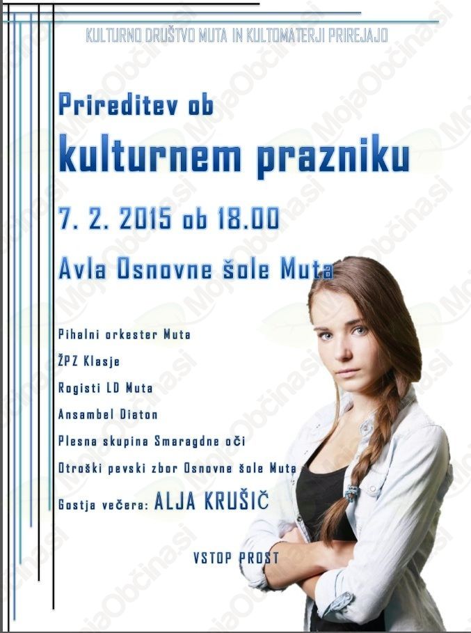 Vabimo vas na prireditev ob slovenskem kulturnem prazniku, ki bo v soboto 7.2.2015 ob 18. uri v avli OŠ Muta. Več si preberite v priloženi priponki.