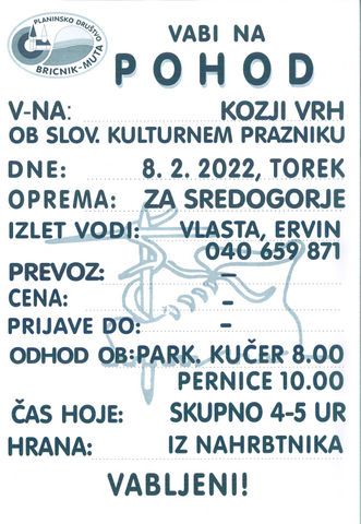 Planinke in planinci so na svoji spletni strani objavili vabilo na pohod na Kozji vrh, ki bo v torek, 8.2.2022. Za več informacij prilagamo fotografijo vabila, hkrati pa objavljamo ostale načrtovane aktivnosti društva v februarju: