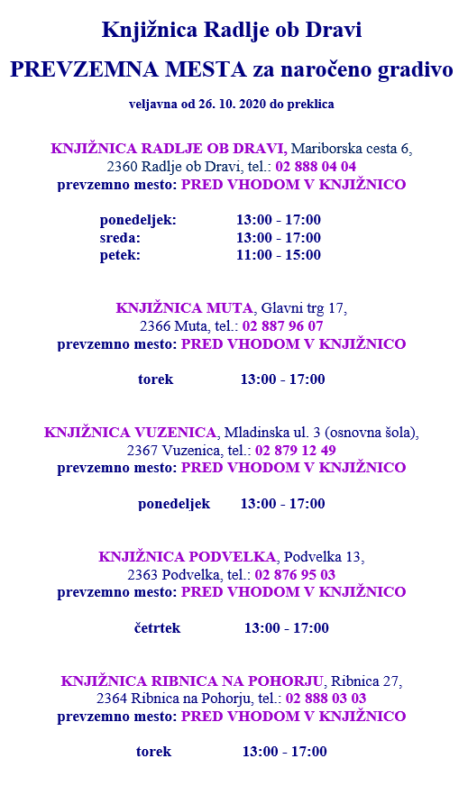 Knjižnica Radlje ob Dravi je v skladu z ukrepi za preprečevanje širjenja okužbe s koronavirusom od ponedeljka, 26. oktobra zaprta.