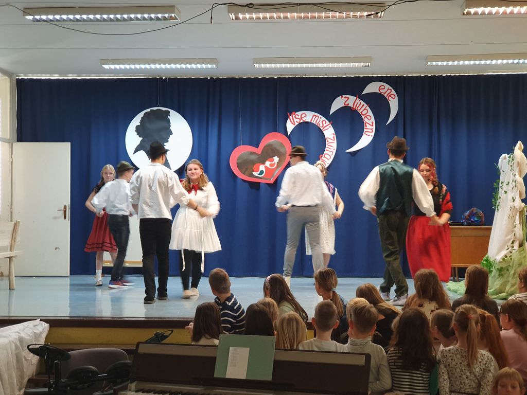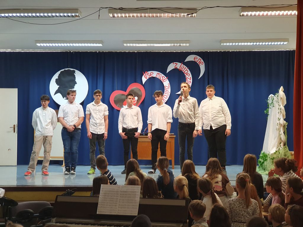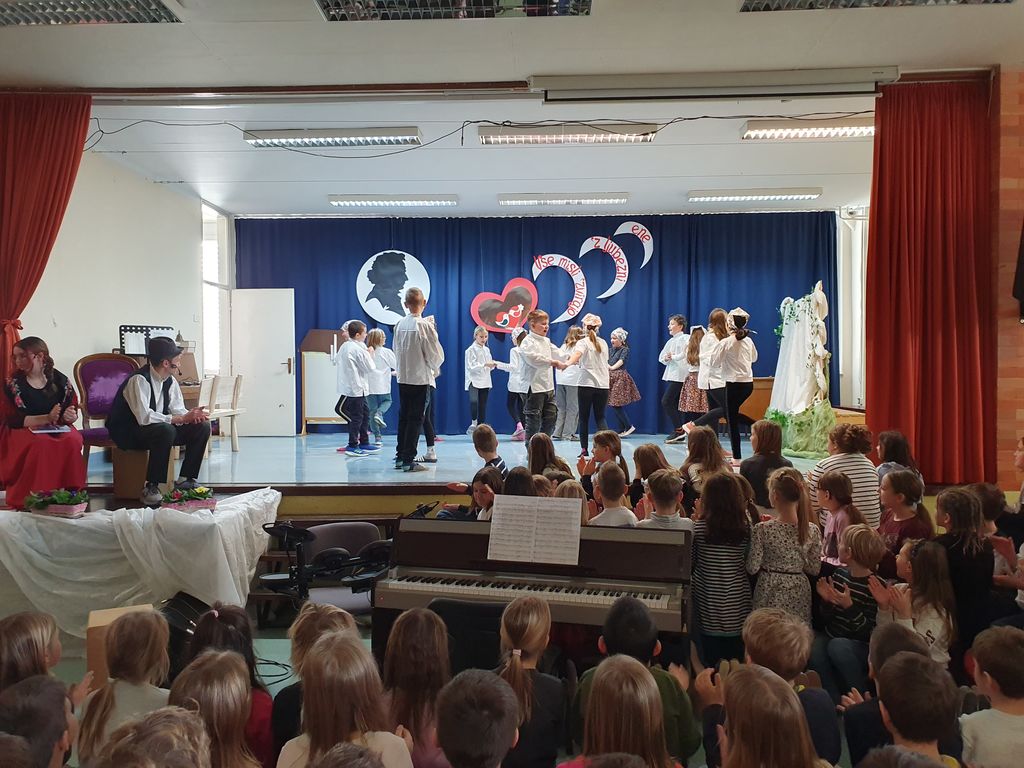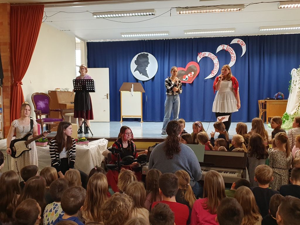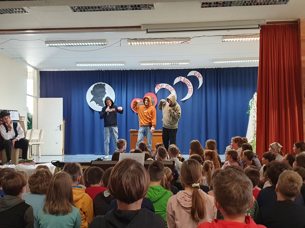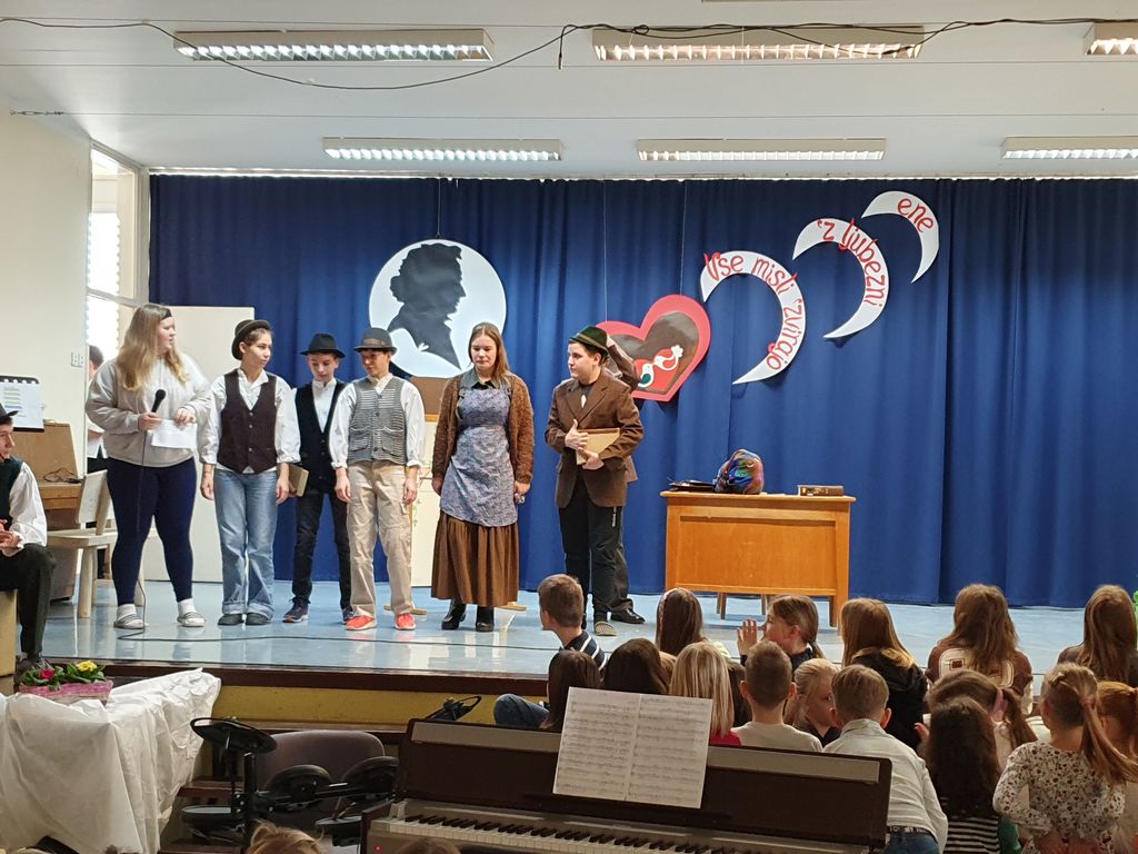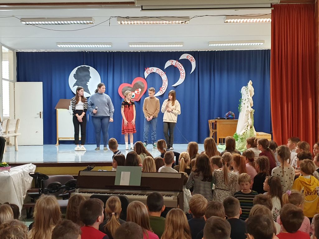 Devetošolci so na odru predstavili Prešernovo Zdravljico in pesem Pod oknom, sonet VIII/5 iz pesniške zbirke domačina Srečka Lampreta, znameniti balkonski prizor iz Shakespearove tragedije Romeo in Julija, Cankarjevo črtico Mater je zatajil in Prežihovo črtico Solzice, Minattijevo lirsko pesem Nekoga moraš imeti rad in Novakovo Ljubezen do besed. Osmošolci so navdušili s svojo interpretacijo Vodnikovega Dramila v raperski preobleki. Manjkalo pa ni niti plesa in glasbe. S plesno točko so se poleg devetošolcev predstavili tudi petošolci. Otroški pevski zbor je zapel Prešernovo pesem Od železne ceste in ljudsko Sonce čez hribček gre, mladinski pevski zbor se je predstavil s Prešernovo Vrbo, šolski ansambel pa je čustveno prireditev zaokrožil s svojo priredbo koroške ljudske pesmi Kje so tiste stezice.