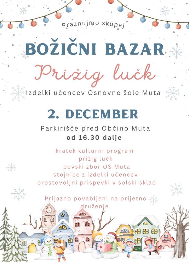 Vabimo vas, da se nam pridružite na šolskem božičnem bazarju, kjer bodo predstavljeni izdelki učencev Osnovne šole Muta, skupaj pa bomo tudi prižgali praznične lučke.