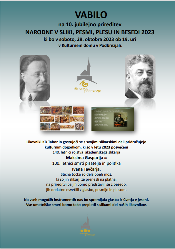 Vabljeni na jubilejno 10. prireditev NARODNE V SLIKI, PESMI, PLESU IN BESEDI 2023, KI BO V SOBOTO 28. OKTOBRA OB 19. URI V KULTURNEM DOMU V PODBREZJAH.