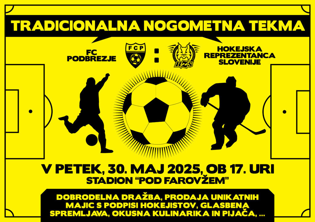 30. maja ob 17. uri vabljeni na tradicionalno nogometno tekmo med FC Podbrezje in hokejsko reprezentanco Slovenije, z dobrodelnim namenom, v Podbrezje na stadion "pod farovžem" .