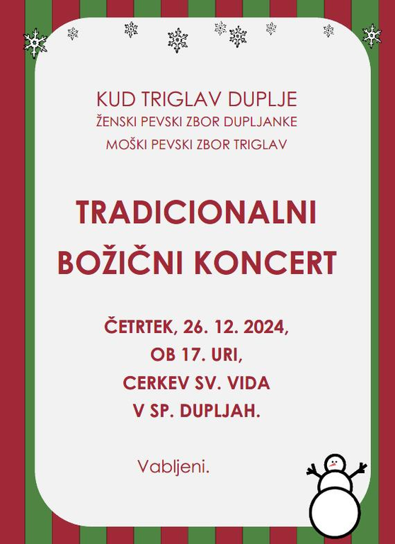 Vabljeni na tradicionalni božični koncert, v četrtek, 26. 12. 2024, ob 17. uri v cerkvi svetega Vida v Spodnjih Dupljah.