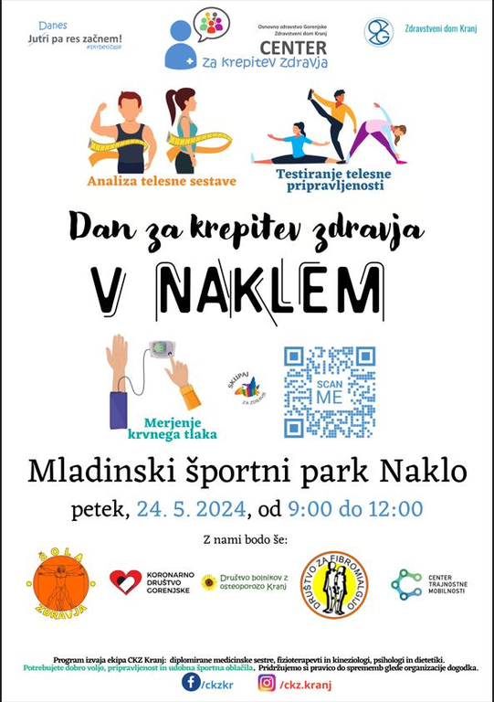 Vabimo vas na tradicionalni ''Dan za krepitev zdravja'', ki se bo odvijal v petek, 24. 5. 2024, od 9:00 do 12:00 ure, v Mladinskem športnem parku v Naklem.