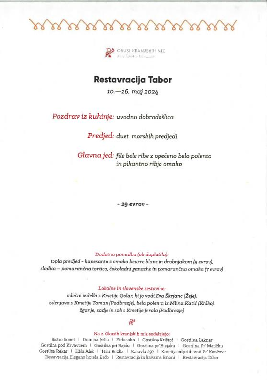 Na 2. Okusih kranjskih miz sodeluje 17 gostiln. Poleg kranjskih so tu še gostilne iz okoliških občin: Naklo, Cerklje na Gorenjskem, Preddvor in Tržič. Iz občine Naklo sodeluje restavracija Tabor.