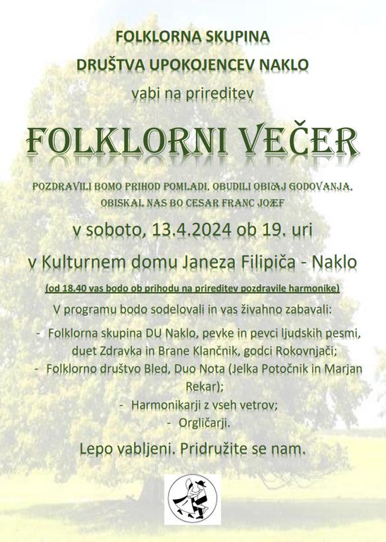 Folklorna skupuna DU Naklo vabi na prireditev Folklorni večer, ki bo 13. 4. 2024, ob 19. uri, v Kulturnem domu Janeza Filipiča v Naklem.