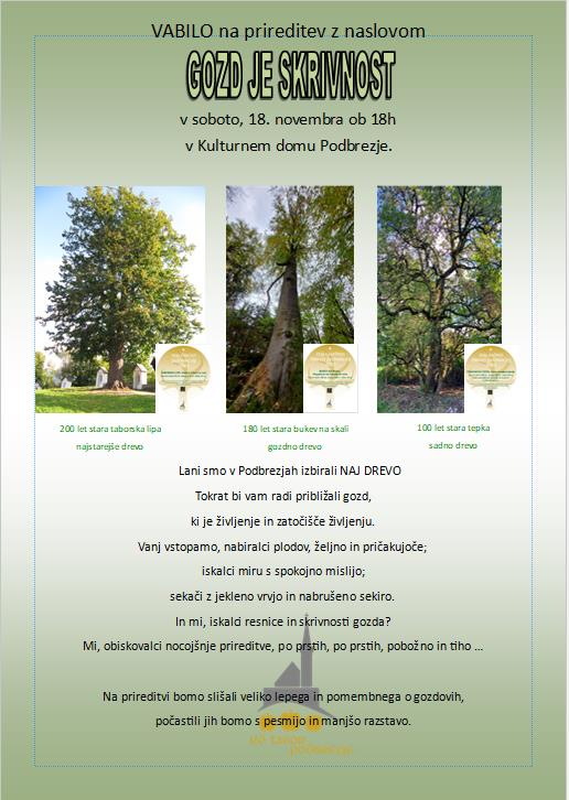 Vabljeni na prireditev GOZD JE SKRIVNOST, v soboto, 18. novembra ob 20. uri, v Kulturni dom Podbrezje.