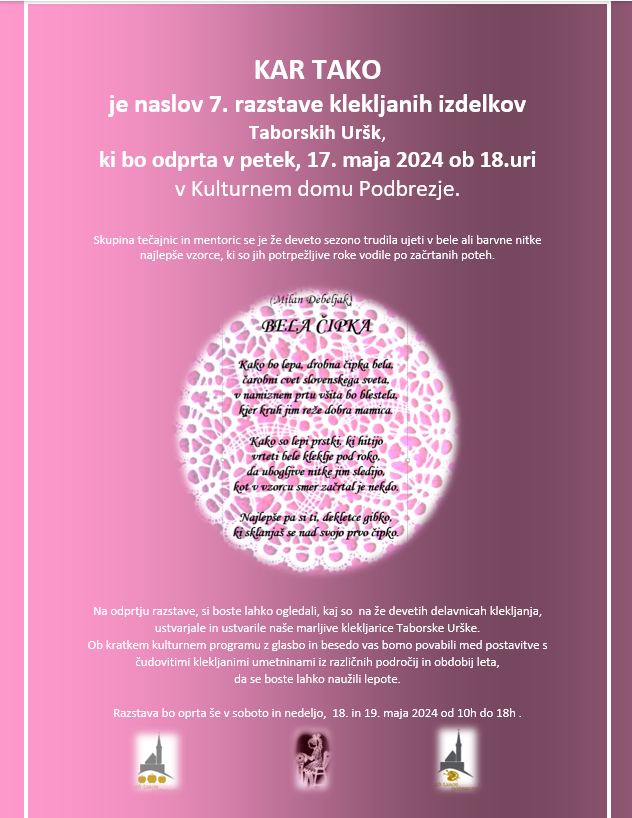 Odprtje 7. klekljarske razstave s kulturnim programom, ki bo vseboval 2 glasbena dela in recitiranje pesmi na temo klekljanja.