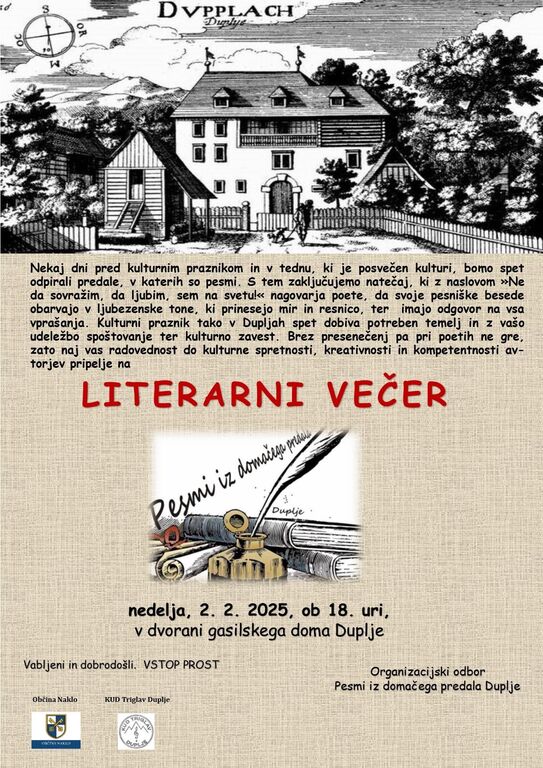 Dobrodošli na večeru poezije, v dvorani gasilskega doma v Dupljah, v nedeljo, 2. 2. 2025, ob 18. uri.