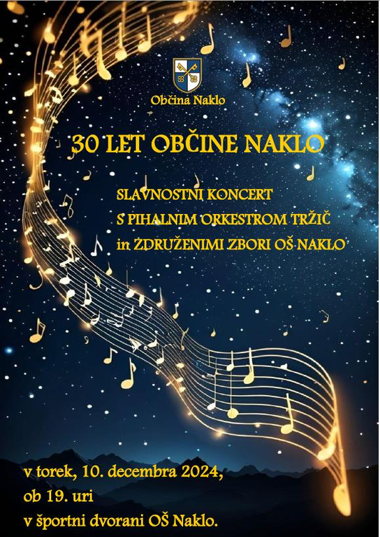 Občina Naklo vas vabi na tradicionalni novoletni koncert, ki bo v torek, 10. decembra 2024, ob 19. uri v športni dvorani OŠ Naklo. S koncertom bomo proslavili tudi 30 let občine Naklo.