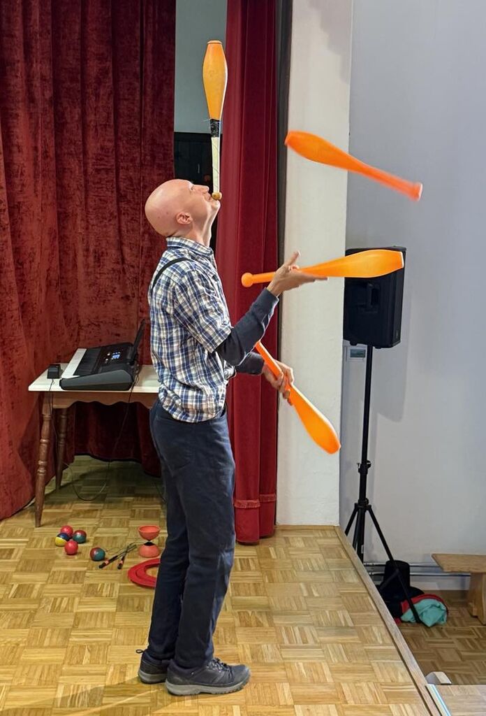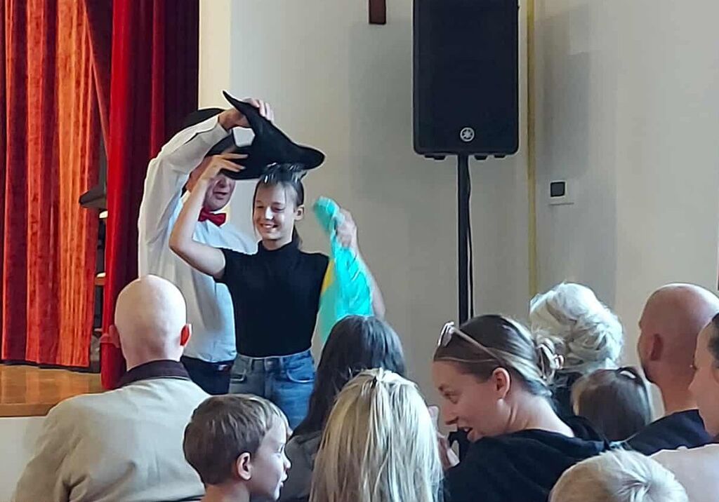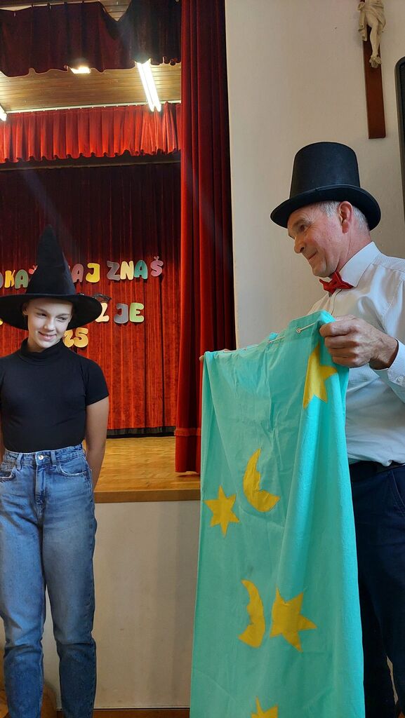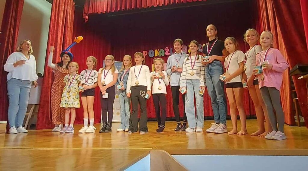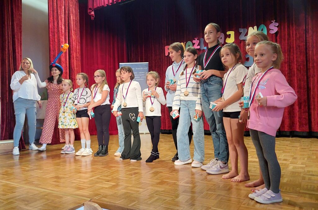 Potem, za zelo zanimiv zaključek, sta na oder prišla Jakob in Maja Bergant s Cirkusa na kvadrat. Posedujeta namreč poseben dar v podobi klovnov, ki združujeta cirkus, komedijo in žongliranje. Jakob je v zrak metal tudi po šest žogic hkrati, šest obročev, pet kegljev in posebno prozorno kroglo, ki je bila videti res zelo čarobno, ko se je sprehajala po njegovih rokah in celo glavi. Po zadnji točki, ki nam je močno ogrela dlani, voditeljica Aniya na oder povabila še ostale nastopajoče in jim podelila medalja z darilci.