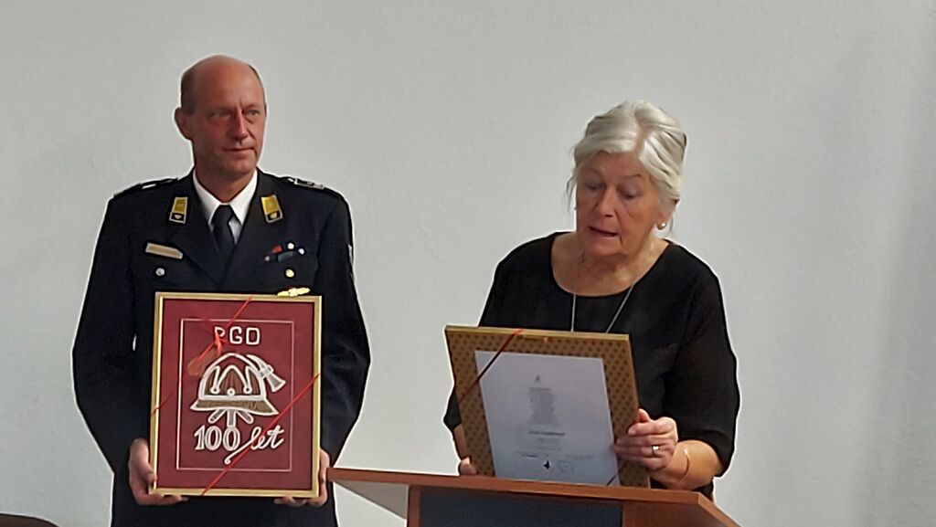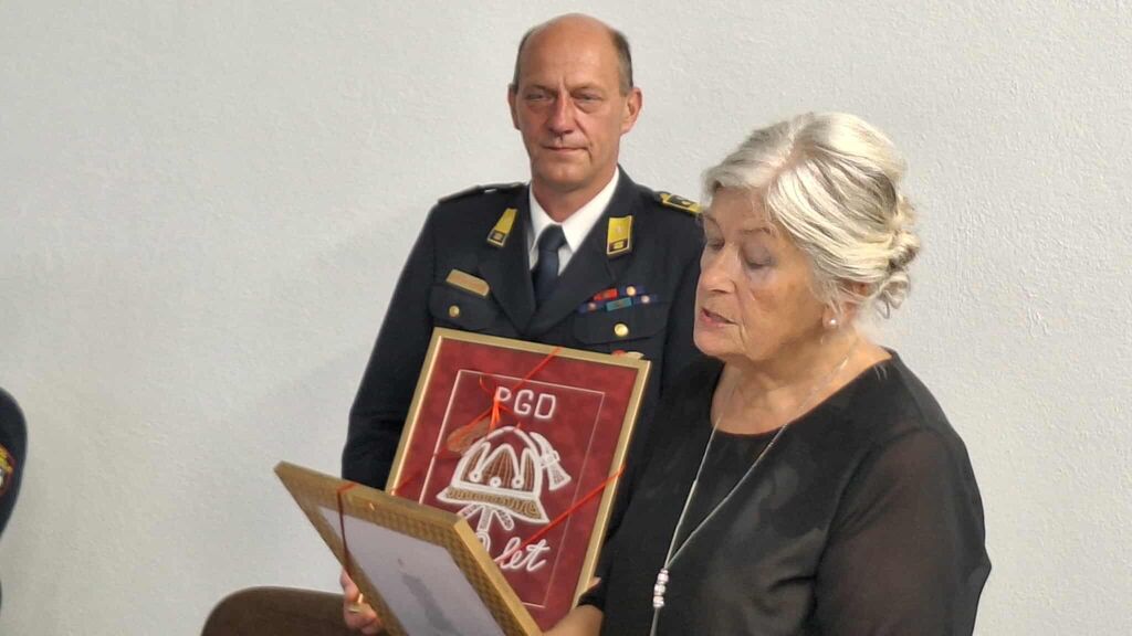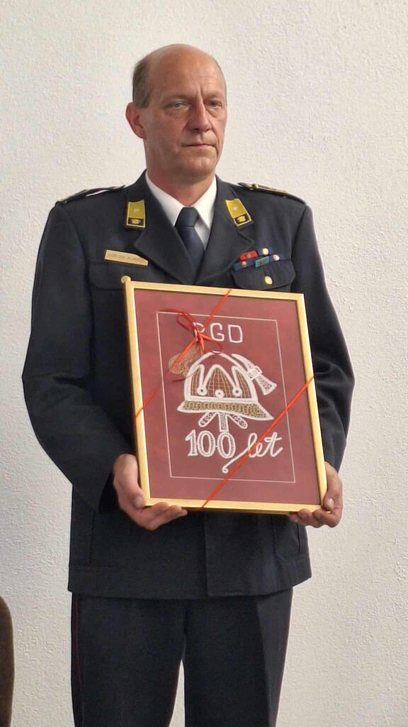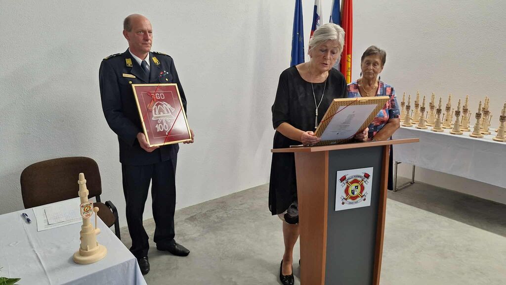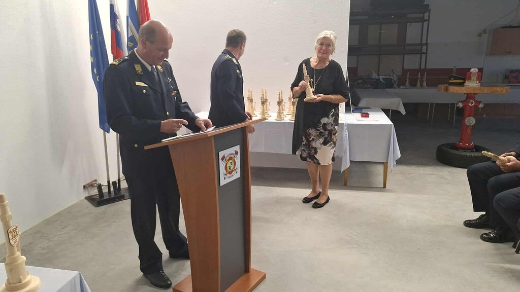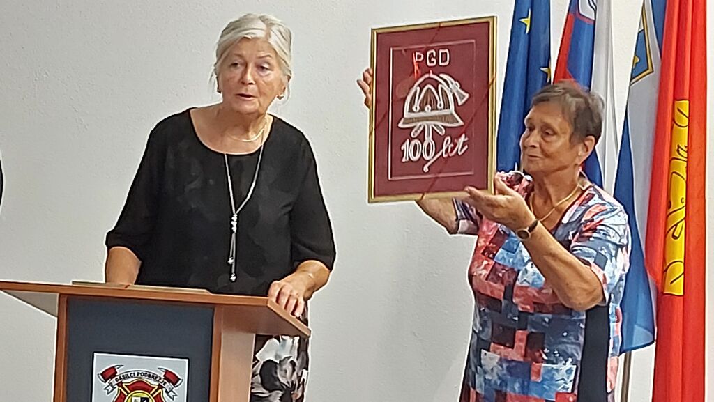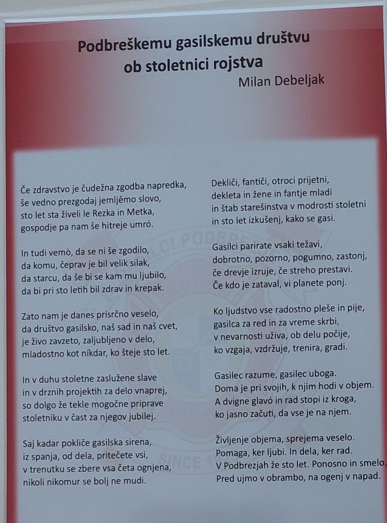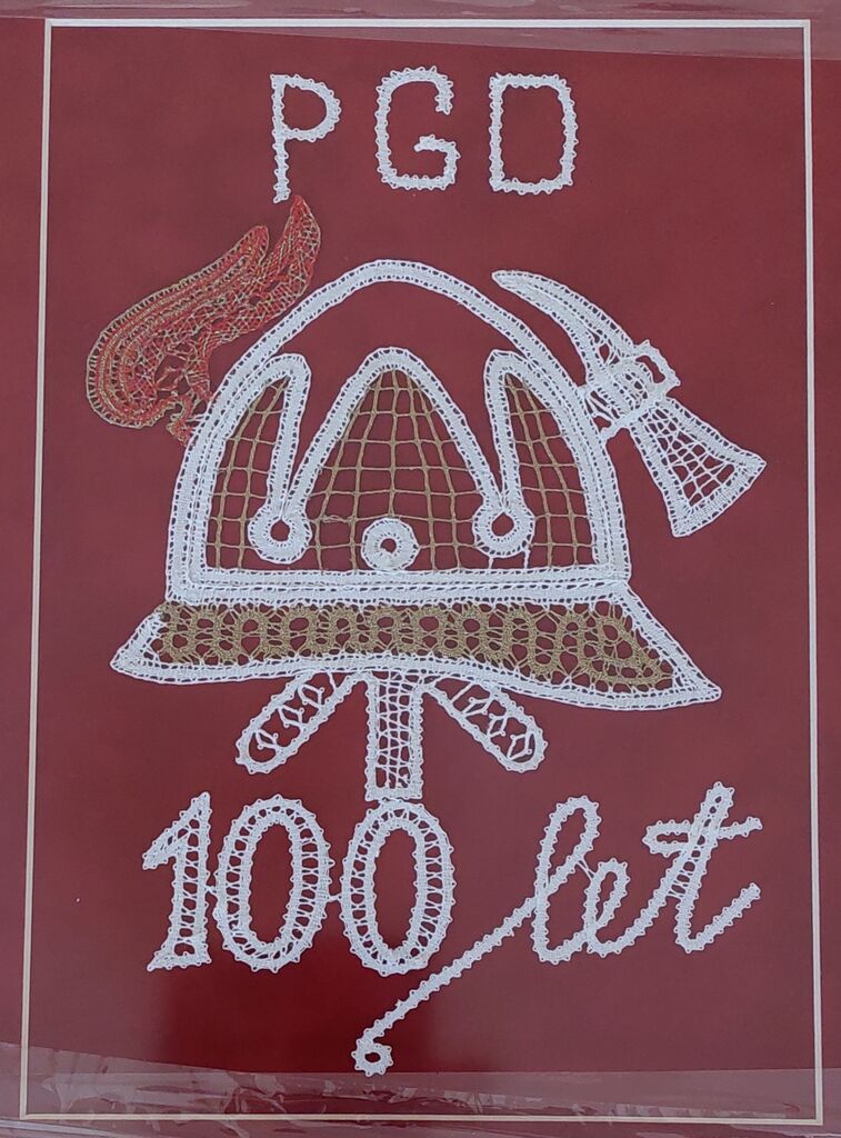 Tudi v Kulturnem društvu Tabor Podbrezje smo se lahko zahvalili za dolgoletno sodelovanje, saj brez naših gasilcev itak ne moremo, ne ob večjih prireditvah ne brez prevoza kolednikov. Ko pa so najavili tako visoko obletnico, se je na našem zboru članov v marcu rodila ideja o klekljanem darilu. Oči so se seveda ustavile na Anici Hvasti, ki se je nemudoma lotila dela. Najprej ustvariti dobro skico za papirc, kupiti sukance ustrezne barve in kleklje v roke. Sliši se enostavno, a ni bilo. No, ko se je delo znašlo lepo uokvirjeno na pravi podlagi, je bila avtorica zadovoljna in vidimo tudi naši vrli gasilci. Milan Debeljak pa je prispeval drugo darilo, svojo pesem zanje, ki jo je namesto njega prebrala Daca in predsedniku PGD Podbrezje izročila lično uokvirjeno.