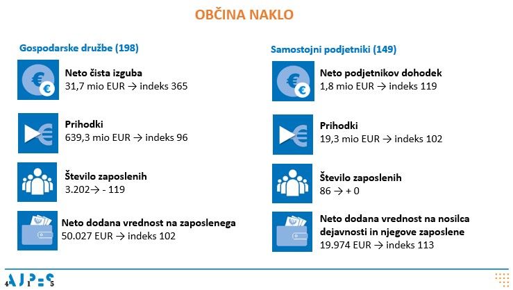 Za leto 2024 je AJPES predložilo podatke iz letnih poročil na poenotenih obrazcih za državno statistiko tudi 198 gospodarskih družb in 149 samostojnih podjetnikov s sedežem v občini Naklo.