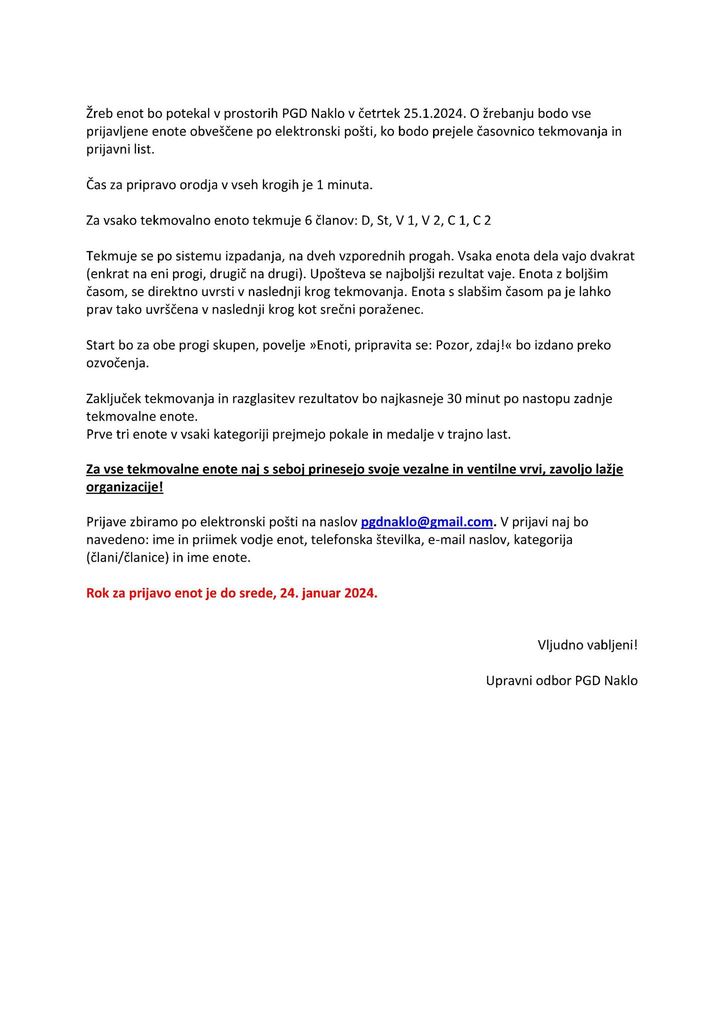Tekmovanje bo v soboto 27.01.2024 predvidoma s pričetkom ob 15:00 uri v osnovni šoli Naklo. Prijave zbirajo do srede 24.01. na naslovu: pgdnaklo@gmail.com
