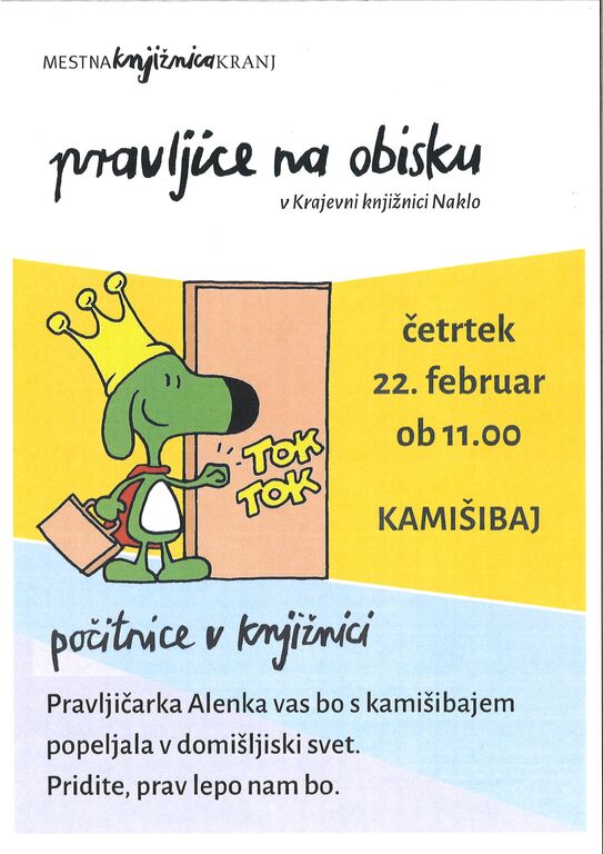 Knjižničarka Helena vas v četrtek, dne 22.2.2024, ob 11. uri, vabi v Krajevno knjižnico Naklo, kjer vas bo pravljičarka Alenka s kamišibajem popeljala v domišljijski svet.