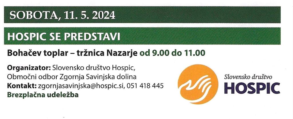 Kontaktni podatki organizatorja: Darja Fale, zgornjasavinjska@hospic.si, +386 (0)51 418 445.