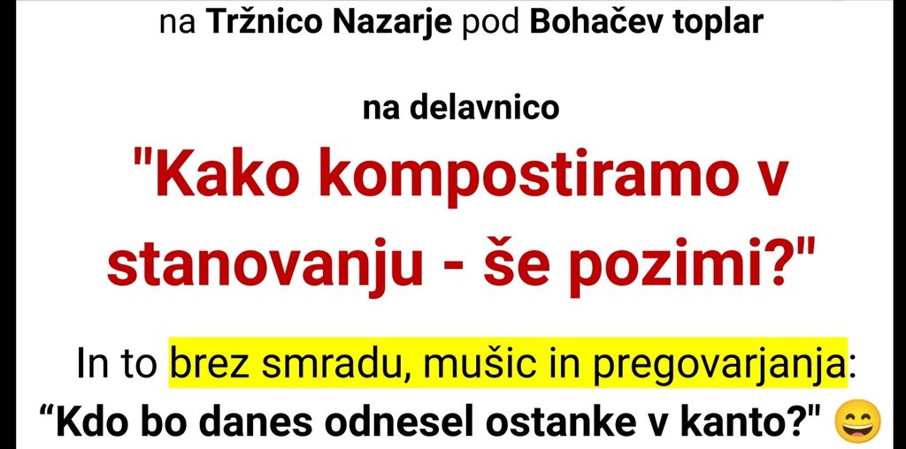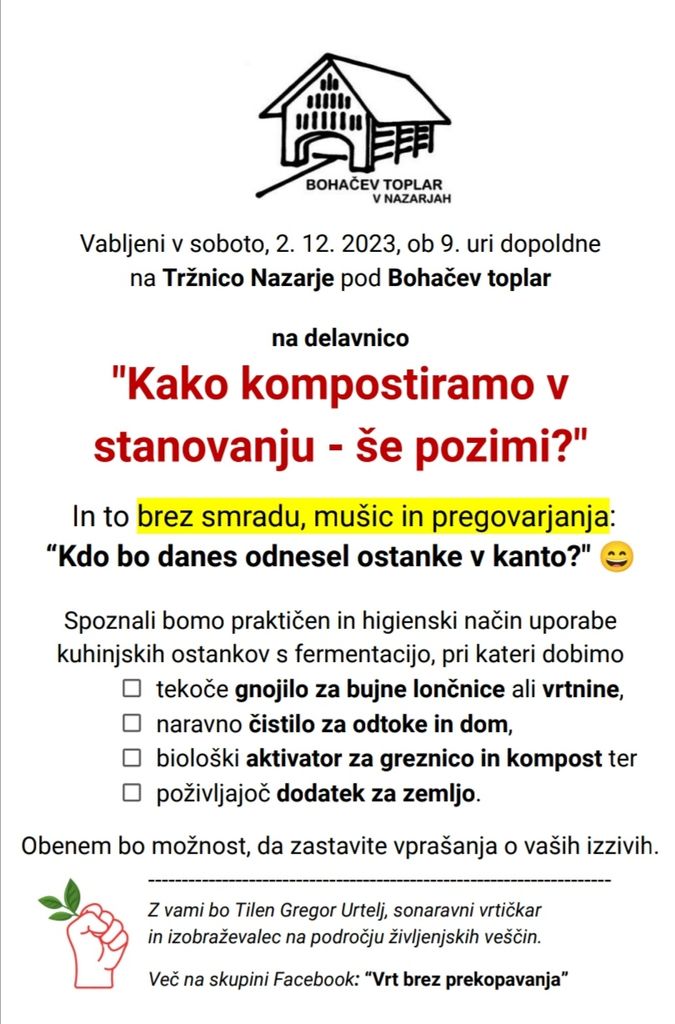 Obiščite sobotno tržnico v Nazarjah pod Bohačevim toplarjem 2. decembra dopoldne ob 9. uri in kljub napovedim mrzlega vremena vam bo ob tem, kar boste videli, slišali, otipali in povonjali, postalo toplo pri srcu.
