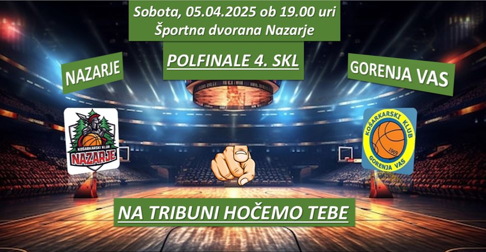 Pred našimi fanti je najpomembnejša tekma v sezoni. Na drugi polfinalni tekmi 4. SKL, v domači športni dvorani gostijo Gorenjo vas. Z uspehom bi se članska ekipa ponovno uvrstila v 3. SKL, zato vabljeni, da skupaj napolnimo Nazarsko lepotico.