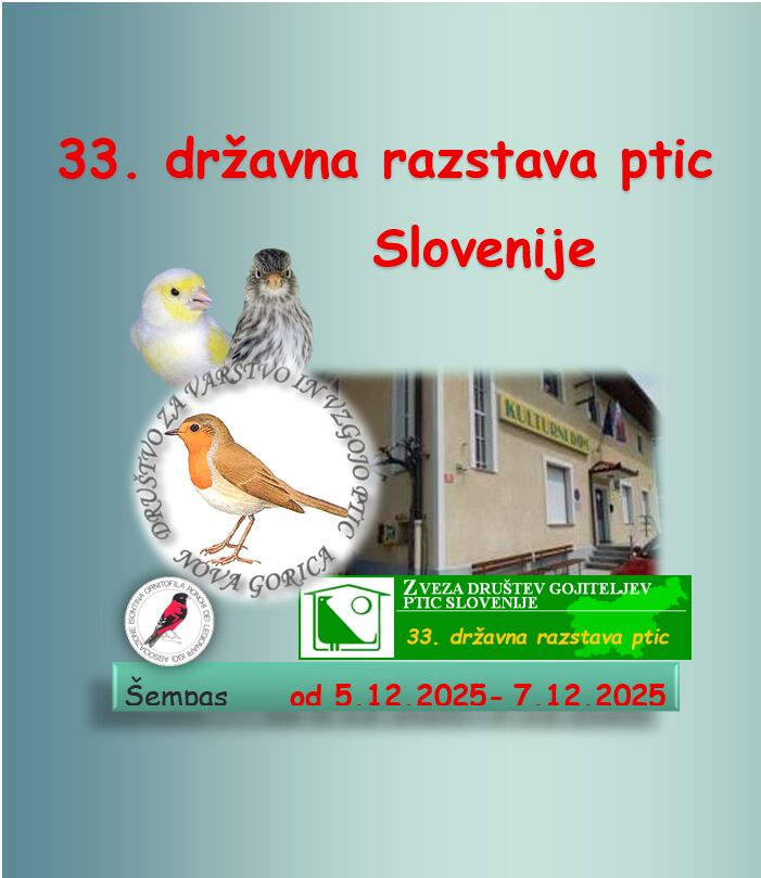 Društvo za varstvo in vzgojo ptic Nova Gorica, organizira 33. Državno razstavo ptic, v času od 5. do 7. decembra 2025 v Kulturnem domu ŠEMPAS.
