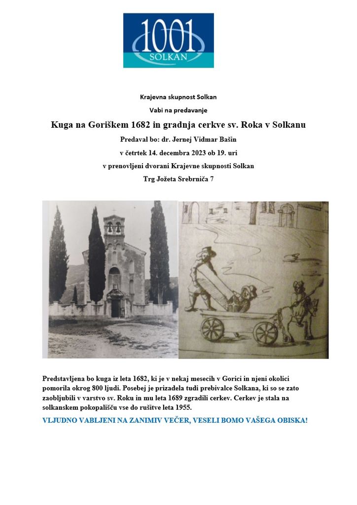 Predstavljena bo kuga iz leta 1682, ki je v nekaj mesecih v Gorici in njeni okolici pomorila okrog 800 ljudi. Posebej je prizadela tudi prebivalce Solkana, ki so se zato zaobljubili v varstvo sv. Roku in mu leta 1689 zgradili cerkev. Cerkev je stala na solkanskem pokopališču vse do rušitve leta 1955.