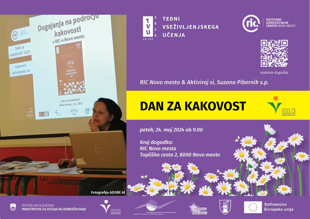 Dan za kakovost, s katerim letos obeležujemo že 20. obletnico od začetka podeljevanja pravice do uporabe znaka v letu 2004, bomo zaposleni v RIC-u Novo mesto preživeli skupaj s Suzano Pibernik, NLP trenerko z mednarodno INLPTA licenco in dolgoletno manadžerko na področju skrbi za uporabnike, razvoja storitev in prodaje.