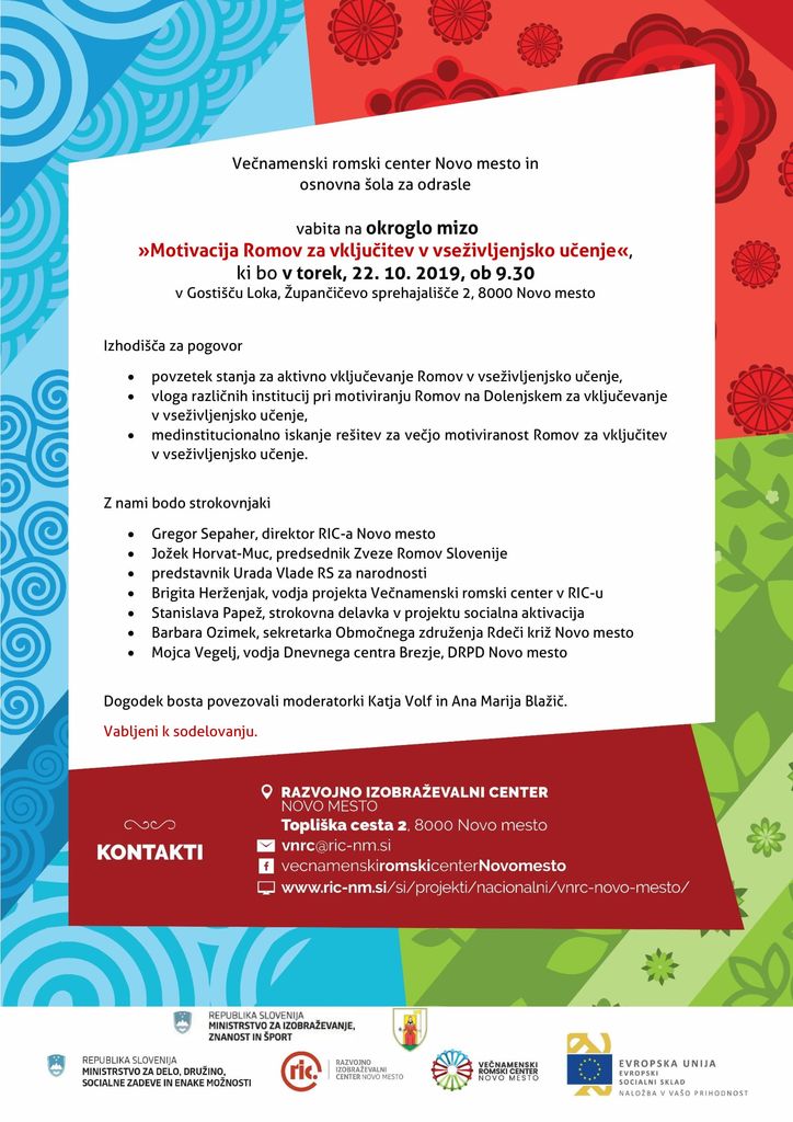 Skozi strokovni pogovor bodo različne institucije predstavile svojo vlogo pri motiviranju Romov na Dolenjskem za vključevanje v vseživljenjsko učenje. Podan bo povzetek trenutnega stanja aktivnega vključevanja Romov v izobraževanje. Okroglo mizo bomo zaključili z medinstitucionalnim iskanjem rešitev naslovne tematike.