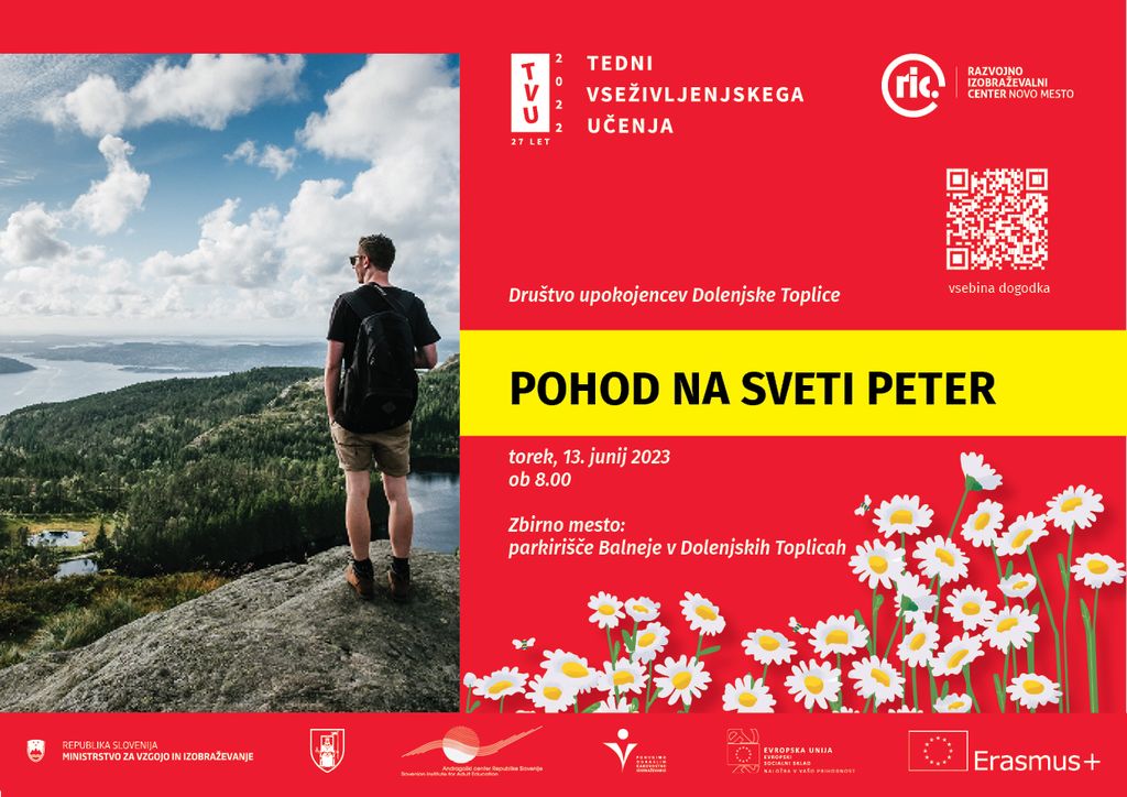 Pohodniki, člani društva upokojencev in zunanji, se bomo zbrali v torek, 13. 6. 2023, na parkirišču Balneje v Dolenjskih Toplicah ob 8. uri. Odpeljali se bomo do Podgozda in začeli pohod. Po gozdni poti se bomo povzpeli na 888 metrov visok hrib Sveti Peter. Z razglednega stolpa je čudovit razgled. Na vrhu je Zavetišče, razgledni stolp in ruševine cerkvica. Zavetišče bo odprto. Malica je iz nahrbtnika. Pot ni zahtevna. Priporočamo pohodne palice in dobro obutev. Udeležba je na lastno odgovornost.