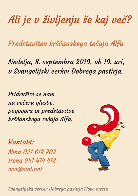 Dogodek je namenjen predstavitvi mednarodnega krščanskega tečaja Alfa, ki ga pod okriljem istoimenske organizacije pripravlja tudi Evangelijska cerkev Dobrega pastirja v Novem mestu.