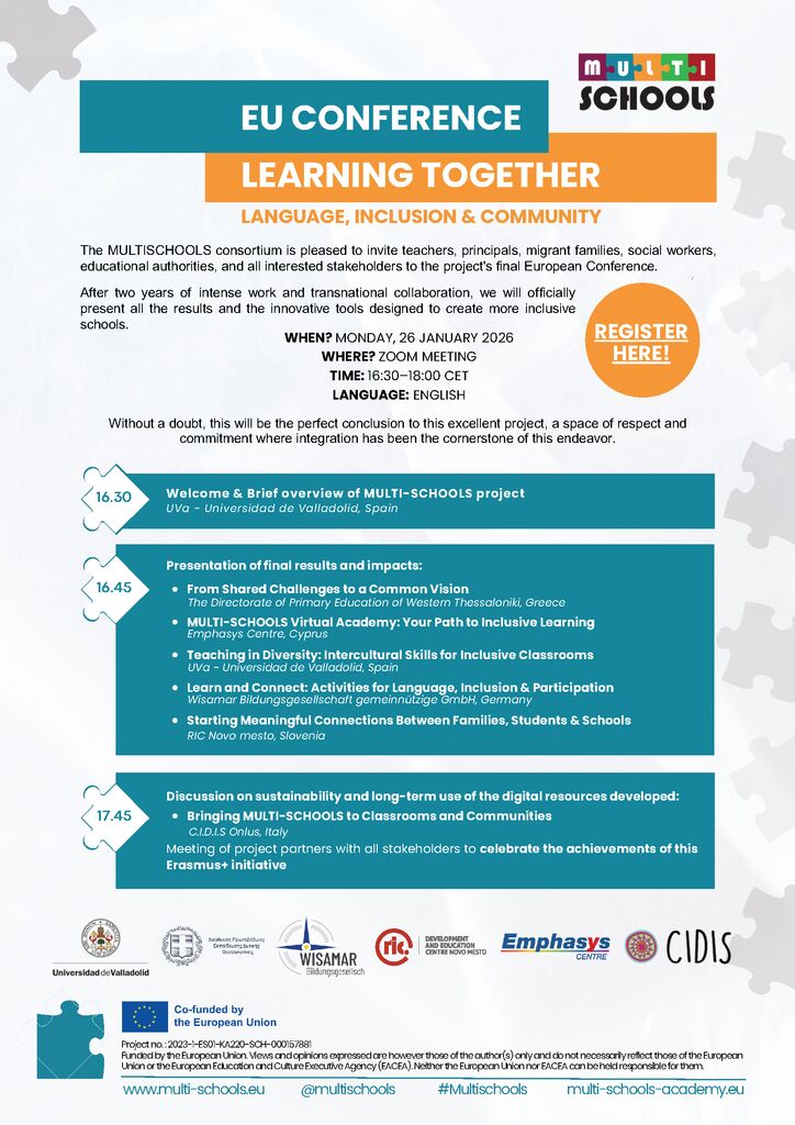 Po dveh letih intenzivnega dela in mednarodnega sodelovanja bomo predstavili rezultate projekta ter inovativna orodja za ustvarjanje bolj vključujočih šol. Dogodek bo priložnost za izmenjavo izkušenj in razpravo o priložnostih za nadaljnje sodelovanje.