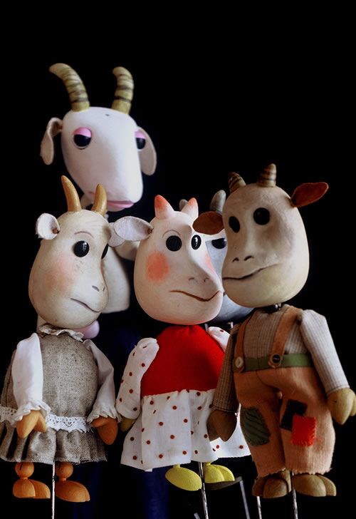 Predstava Volk in kozlički je nastala po znani Grimmovi (Jacob Grimm (1785–1863) in (Wilhelm Grimm (1786–1859)) pravljici Volk in sedem kozličkov. Predstava je bila leta 2001 režijski prvenec Roberta Waltla, takratnega diplomanta igre na ljubljanski AGRFT, kasnejšega igralca Lutkovnega gledališča Ljubljana ter ustanovitelja in direktorja Mini teatra. Likovna zasnovo je pripravil slikar Daniel Demšar, ki se ob likovnem ustvarjanju ukvarja z oblikovanjem scen, kostumov in lutk za vsa vidnejša lutkovna gledališča v Sloveniji. Je avtor številnih človeških, živalskih in domišljijskih bitij, s katerimi nadgradi besedna sporočila lutkovnih predstav. Glasba izhaja iz etnoloških motivov in jo je na sodoben način obdelal Peter Kus, skladatelj, ki je z glasbo opremil več plesnih, otroških predstav in nemih filmov, nekdanji vodja skupine Pavel Vlasov sekstet in član etno skupine Tolovaj Mataj.
