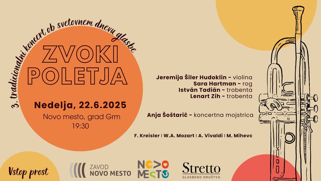 Ob svetovnem dnevu glasbe vas prisrčno vabimo na tretji tradicionalni koncert Zvoki poletja, ki bo v nedeljo, 22. junija 2025 ob 19:30, v čudovitem ambientu gradu Grm v Novem mestu.
