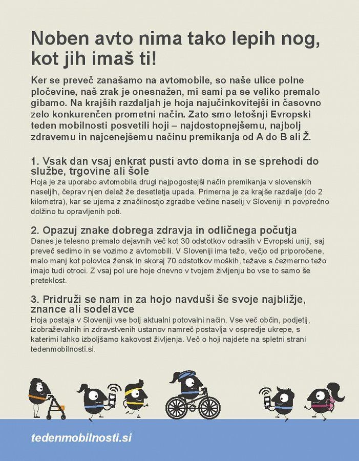 V Mestni občini Novo mesto v sklopu Evropskega tedna mobilnosti (ETM) od ponedeljka potekajo številne izobraževalne, športne in družbeno zanimive aktivnosti z namenom spodbujanja spremembe mobilnostih navad, uvedbe in promocije trajnostnih prometnih ukrepov. Šolarji pešačijo na Pešbusu, občani se lahko udeležijo kolesarskega izleta in pohoda, vrhunec dogajanja pa bo v petek, 20. septembra, z dogodkom Dan brez avtomobila, ki letos poteka na Glavnem trgu.