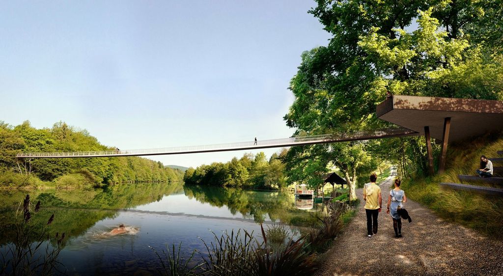 Le 42 centimetrov debela in 4 metre široka konstrukcija mostu za pešce in kolesarje bo na obeh bregovih zasidrana v betonska bloka, ki bosta sidrana s trajnimi geotehničnimi sidri v kompaktno skalnato osnovo. Most bo brez podpor v strugi in bo v enem razponu dolžine 120,5 metra premoščal reko Krko, obenem pa se bo na obeh bregovih mehko priključil na brežino brez opaznih opornikov ali visokih nasipov. Najnižja točka mosta je približno štiri metre nad gladino stoletnih vod oz. bo ob normalnem vodostaju cca. 11 metrov nad gladino reke. Izbrana zasnova mosta za pešce in kolesarje bo zgrajena po tehnologiji nateznih trakov (Stress Ribbon Bridge) in je ena izmed najstarejših tipov konstrukcijskih zasnov mostov. Zelo tanka betonska konstrukcija bo položena na jeklene kabelske vrvi, ki potekajo v obliki verižnice. S prednapenjanjem s kabli znotraj betonskega preseka, pohodna konstrukcija dobi dosti večjo togost in je manj občutljiva na dinamične obtežbe.