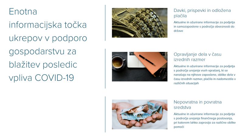 Z namenom spopadanja s problematiko COVID-19 in učinkovitimi ukrepi za gospodarstvo, ki je eno najbolj prizadetih področij v državi, je javna agencija SPIRIT Slovenija vzpostavila informacijsko točko za podjetja - novo spletno mesto, na katerem lahko pridobite vse informacije o ukrepih za podporo gospodarstvu za blažitev posledic vpliva COVID-19 na enem mestu. V okviru spletnega mesta je pred kratkim zaživel tudi Poslovni forum, ki je namenjen neposredni in hitri komunikaciji med podjetji, izmenjavi informacij, uporabnih gradiv in dobrih praks.