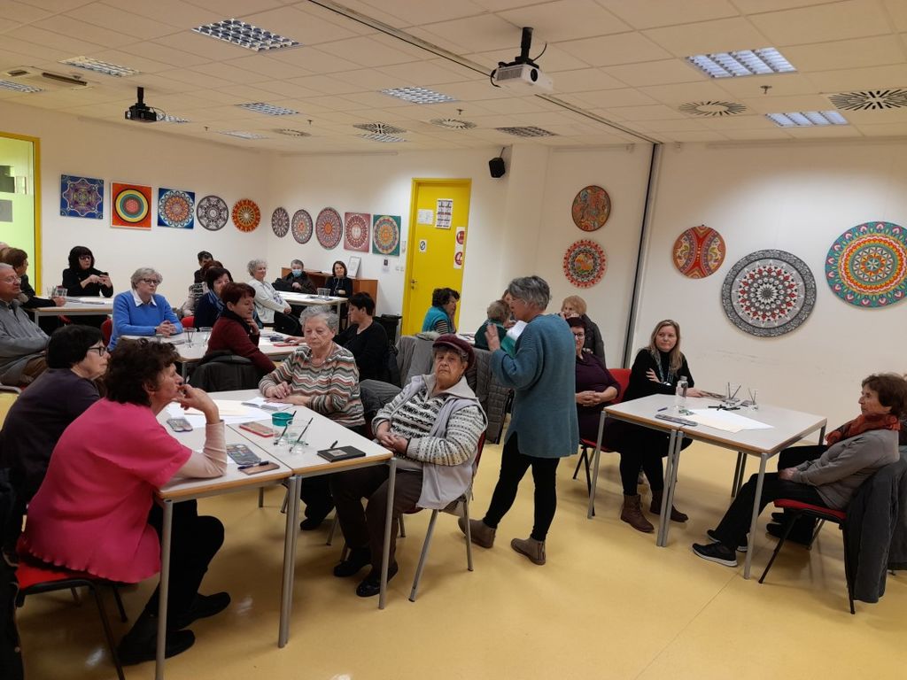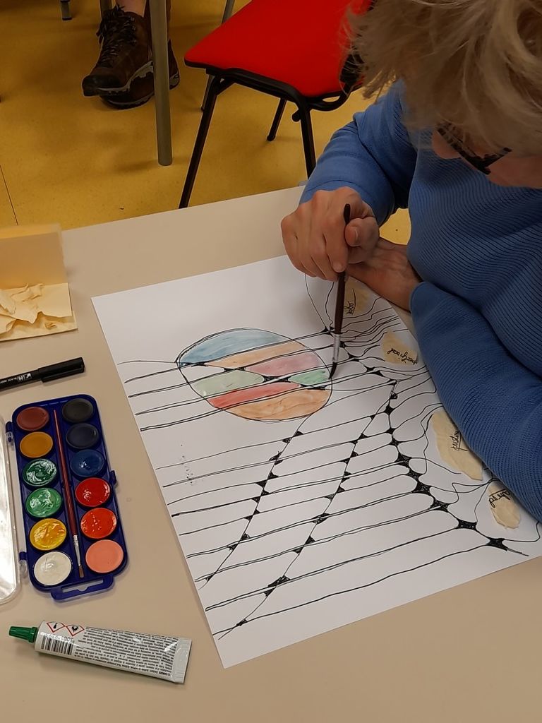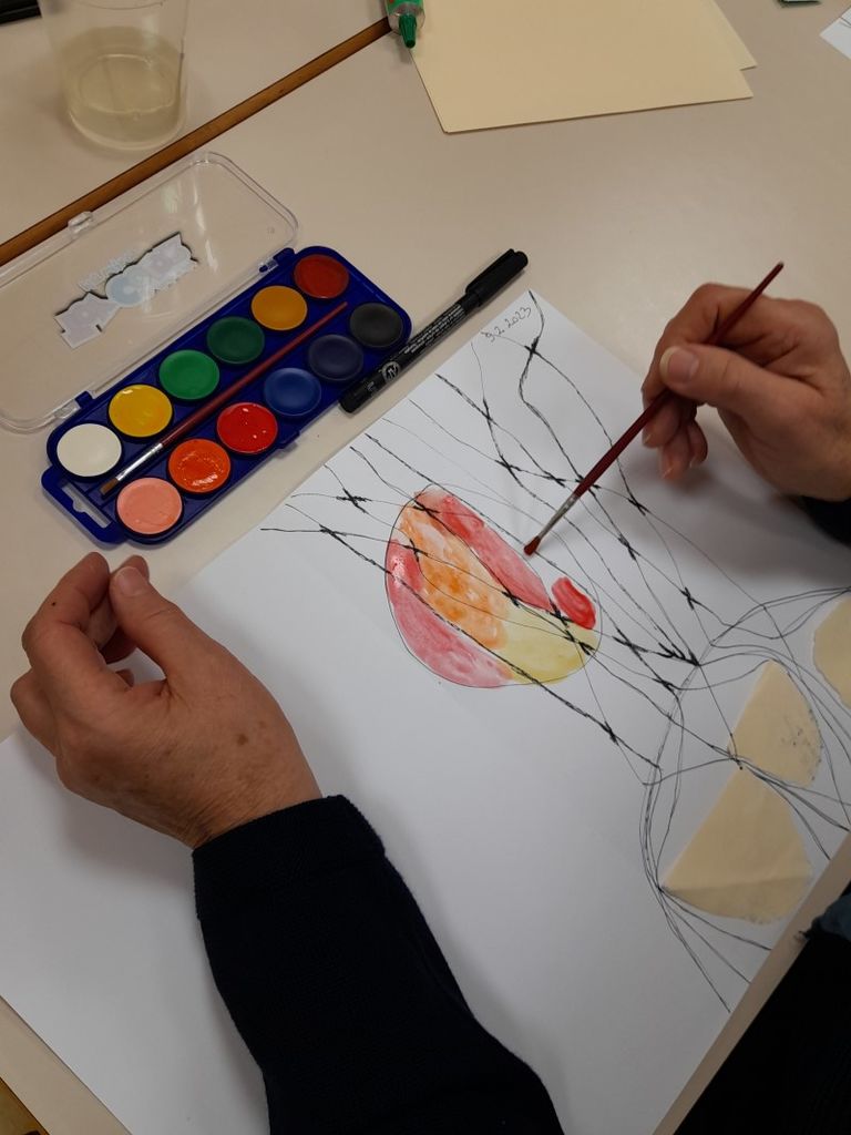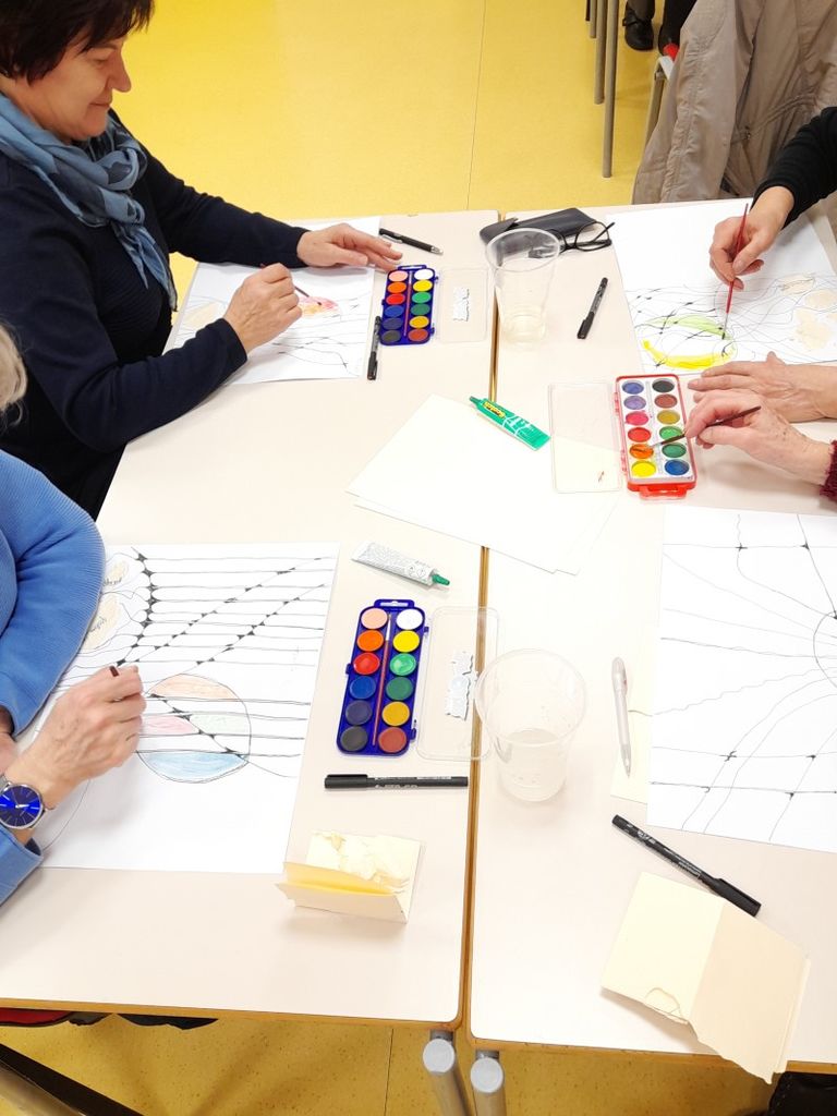 Kar dolgo smo čakali na to napovedano temo: Naj pride nova energija. Pedagoginja in svetovalka Tea Sulič je RIC-eva uslužbenka, ki je za nas bila nova predavateljica. Že začetek Četrtkovega srečanja je bil drugačen. Kar pet delovnih miz s stoli so dale vedeti, da danes ne bomo samo poslušali, ampak tudi ustvarjali. Na mizah nas je čakal papir, čopiči, vodene barvice, flumastri. To je bil za nas izziv, da s svojim ustvarjanjem poiščemo pot k sebi in iščemo, kaj si želimo in česa nočemo več. Najprej pa je bilo treba izklopiti vse moteče, da smo lahko s sabo. Dobro pripravljeni smo se predali navodilom in začeli z delom.