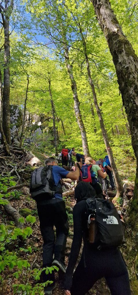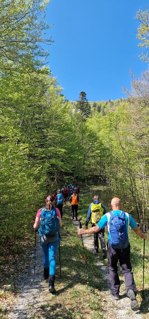 V nedeljo zjutraj, 12. maja, se nas je zbralo 28 pohodnikov, in napotili smo se s tremi kombiji in enim osebnim avtomobilom proti vasi Jasenak. Po nekaj kilometrih zabavne vožnje po makadamski cesti, smo prispeli na naše izhodišče.