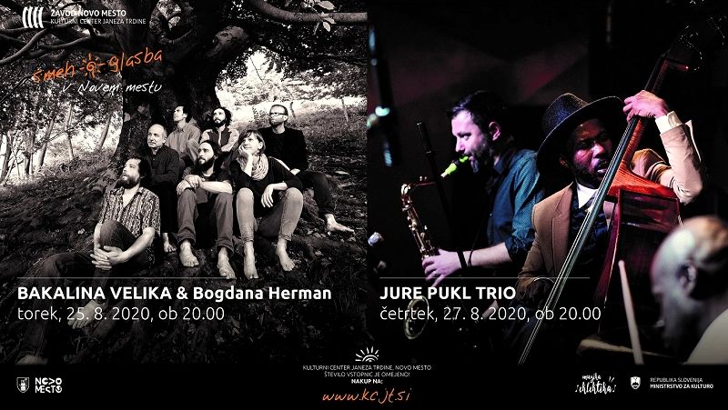 Kot prvo bodo gostili skupino Bakalina Velika, ki prihaja iz tolminskih koncev. V svoj repertoar, zaznamovan s čadrsko govorico, vključuje tudi družbenokritična sporočila. Gostja večera bo Bogdana Herman, pevka in raziskovalka že pozabljenih ljudskih pesmi. Drugi dan je najprej namenjen otrokom in vsem, ki se še niste odrekli otroku v sebi, saj v goste prihaja Damjana Golavšek s toplo glasbeno pravljico Mojca Pokrajculja. Zvečer bo Tadej Toš s pravim, toplim, osvobajajočim, zdravim smehom, ki je poleg vsega še hudo nalezljiv in povezovalen, poskrbel za razteg smejalnih mišic in kravžljanje sivih celic. Na zadnjem koncertu, ko bo na odru Jure Pukl z mednarodno glasbeno zasedbo, boste prišli na svoj račun ljubitelji džezovske glasbe. Puklove avtorske kompozicije so drzne, sodobne, melodično kreativne in ritmično pestre, s srcem pa se posveča moderni interpretaciji džezovske glasbe. Že v ponedeljek, 24. 8., ob 19.00, pa vabimo pred KCJT na promenadni koncert Mestne godbe Novo mesto. Glasbeniki bodo pot nadaljevali do Loke in ob Krki do Glavnega trga, od koder se bodo v ritmu koračnice vrnili pred KCJT.